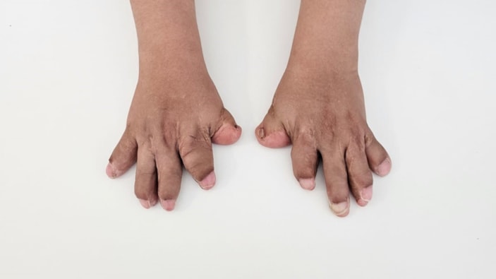 Umut doğuştan Apert sendromlu. Bu hastalıkta parmaklar yapışık ve eller yumruk gibi görünüyor. Parmakları açtırmak için aileler çok yol kat ediyor ama ameliyat zor ve birçok doktor cesaret edemiyor. Hastalık yüz binde bir görülür, genetik bir durumdur. Umut’un parmaklarını açtık, kalan yapışıklıkları düzelttik. Artık her iki elinde toplam 10 parmak var ve kişisel ihtiyaçlarını kısmen karşılayabiliyor. İlerleyen dönemde fizik tedavi ile yetenekleri gelişecek. Ayrıca kısa parmaklarını kalçadan alınan kemiklerle uzatma planımız var. Bu sayede elleri daha doğal görünecek.