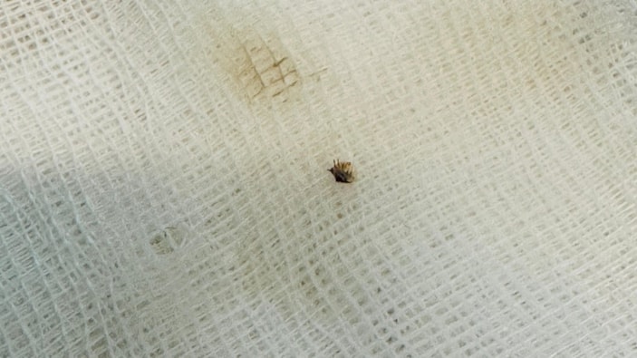 Cilt hastalıkları uzmanı Dr. Mehmet Alataş tarafından yapılan detaylı incelemede, kadının göbek çevresine yapışmış bir kene tespit edildi.