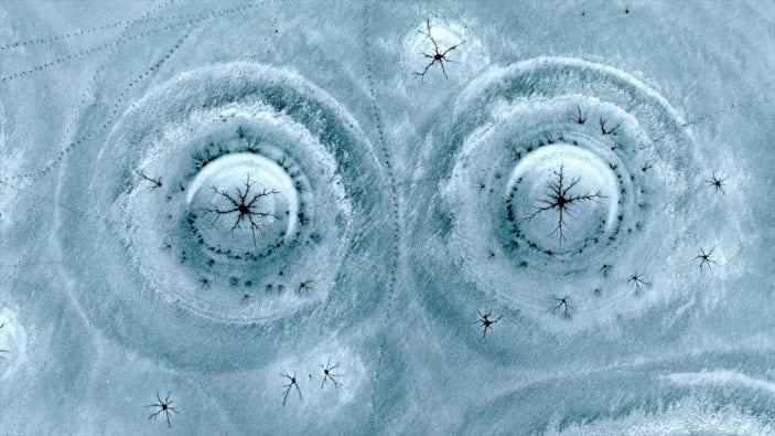Drone'la kaydedilen görüntülerde, göl yüzeyinde halka formunda buz yapıları ve bu halkaların merkezinden çevreye doğru yayılan çatlaklar net şekilde görüldü. Beyaz ve açık mavi tonların hâkim olduğu buz tabakası, havadan bakıldığında insan gözünün iris ve göz bebeğini çağrıştıran desenler oluşturdu.