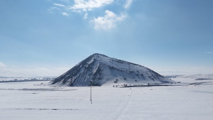 Muş’ta 'Muş Piramidi' olarak anılan Mercimek Kale Höyüğü, yoğun kar yağışının ardından beyaza büründü. Tarihi ve doğal yapısıyla dikkat çeken höyük, kış manzarasıyla görsel bir şölen oluşturdu.