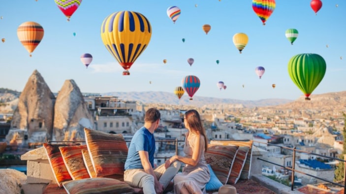 Peri bacaları, vadi yürüyüşleri, sıcak hava balonları ve mağara otelleriyle Kapadokya romantizmin sembolü.