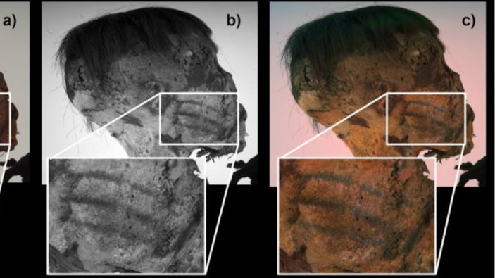 Ekip, mumyalama nedeniyle koyulaşan ten rengi yüzünden zor görülen dövmeleri tahribatsız görüntüleme teknikleriyle inceledi.