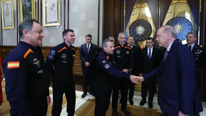 Cumhurbaşkanı Erdoğan, Alper Gezeravcı, ABD ve İspanya'yı temsilen misyon lideri Michael Lopez-Alegria, İtalyan Hava Kuvvetlerinden Pilot Walter Villadei ve Avrupa Uzay Ajansı adına katılan İsveçli Marcus Wandt'tan oluşan Axiom Mission 3 (Ax-3) ekibini Cumhurbaşkanlığı Külliyesi'nde kabul etti.