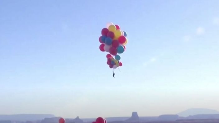 Çocukluk hayali olan balonla uçma denemesini gerçekleştirmek için kızıyla birlikte ABD'deki Arizona çölüne gelen Blaine, helyum dolu balonlarla yaklaşık 9 bin 144 metre yükselerek Everest dağından bile yükseğe uçtu.