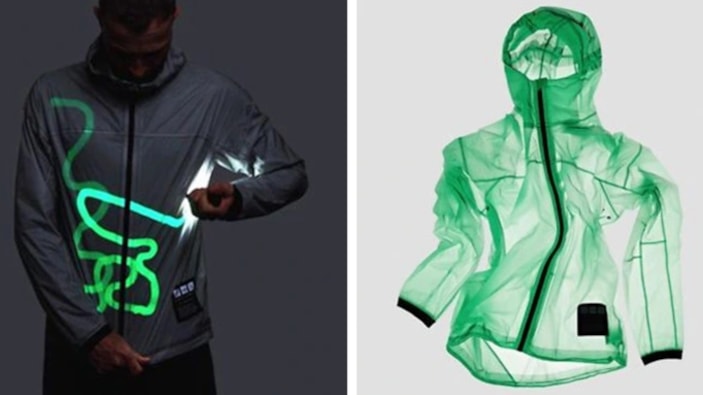 Bu güneş enerjisiyle şarj edilen ceket, yüksek duyarlılığa sahip özel bir malzemeden yapılmıştır. Bulabileceğiniz herhangi bir ışık kaynağıyla karanlıkta parlayabilir.