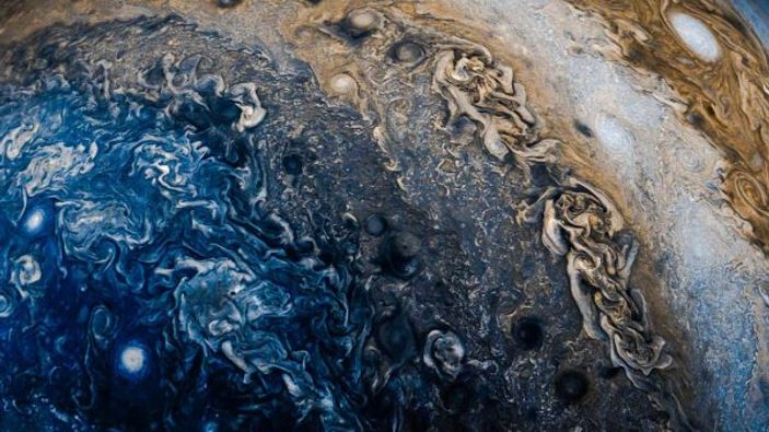 Jüpiter, birbiri etrafında dönen dev gaz fırtınaları ve büyük kırmızı lekesiyle biliniyor ve gezegene gönderilen Juno aracı, yaklaşık 25 bin kilometre yükseklikten gaz bulutunu fotoğraflıyor.