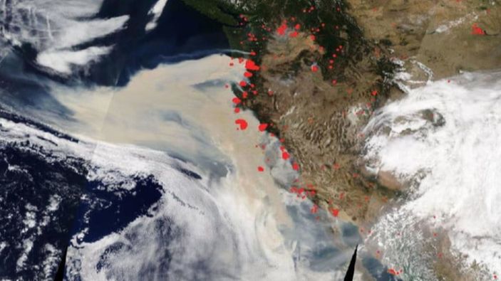 Kırmızı işaretler, orman yangınlarının şu anda Washington'dan Kaliforniya'ya kadar nerelerde devam ettiğini, ortadaki kahverengi dumanlar ise yangın sonucu oluşan yoğun dumanların Pasifik Okyanusu'na doğru kaydığını gösteriyor.
