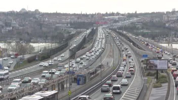 Uzun araç kuyruklarının oluştuğu Haliç'teki trafik yoğunluğu kameraya yansıdı.