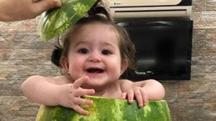 Aydın'da Mustafa Avohan, sıcaktan bunalan 7 aylık kızı Alya'yı, içini oyduğu 18 kiloluk karpuzun içine koyarak serinletti.