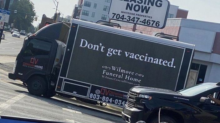 Carolina eyaletinde hayali "cenaze evinin" bir kamyonete verdiği "Aşı olmayın" yazılı reklam, sosyal medyada gündem oldu.