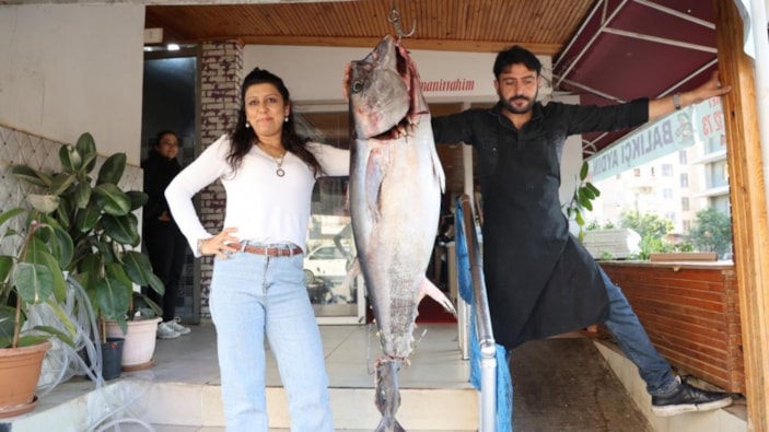 Adana'nın Kozan ilçesinde yaşayan ve balıkçılık yapan Aydın Beştepe, 55 kilogram ağırlığında 1 metre 75 santimetre büyüklüğünde yakaladığı orkinos cinsi balığı dükkanının girişine astı.
