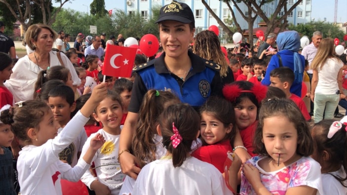 Kutlamaların yapıldığı Yüreğir ilçesindeki Yahya Kemal Beyatlı 100. Yıl İlkokulu'nu da ziyaret eden polisler, öğrenciler tarafından çiçeklerle karşılandı.