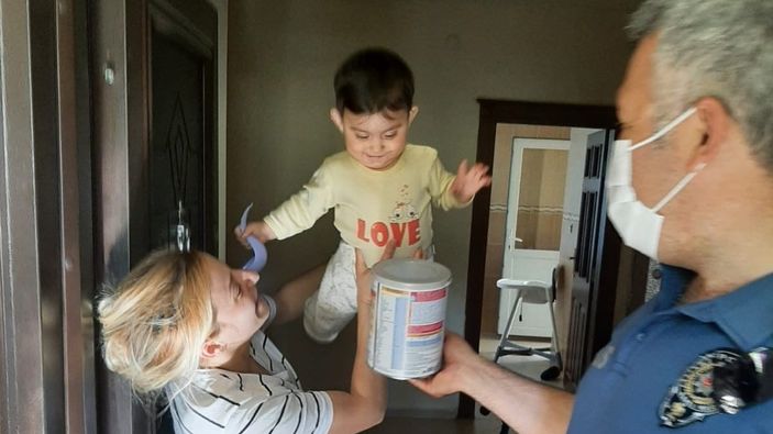 Bebek kapıda elinde mama ile polisi görünce çok sevindi. Anne Songül Hak, polislere teşekkür etti.