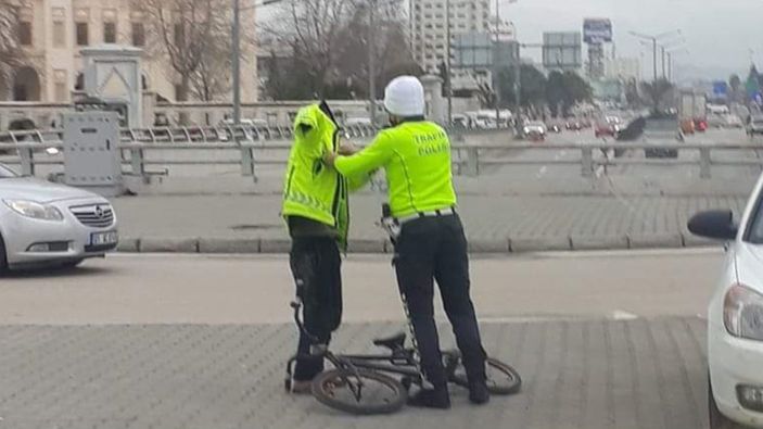 Uygulama noktasından bisikletle geçen çocuğa montunu veren polis memuru, sosyal medyada yayılan fotoğrafın ardından konuştu. Polis, üşüdüğünü gördüğü için montunu çocuğa verdiğini söyledi.