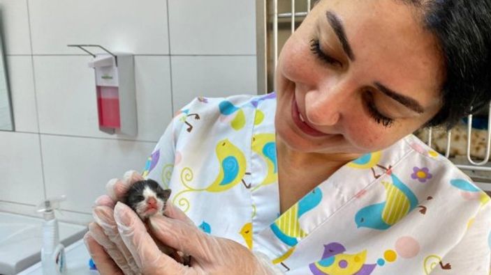 Adana'da kısırlaştırma işlemi uygulanacakken gebe olduğu anlaşılan kedinin, 10 gram ağırlığında ve 10 santimetre uzunluğunda doğan yavrusuna, özel beslenme programı uygulanıyor.