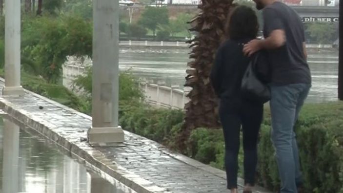 Adana’da öğlen saatlerinde başlayan yoğun yağış nedeniyle şehirde hayat olumsuz etkilendi. Birçok eve su basarken sokaklar adeta felç oldu. Ancak bir çift bu duruma aldırış etmeden el ele tutuşup sokakta yürümeye devam ettiler.