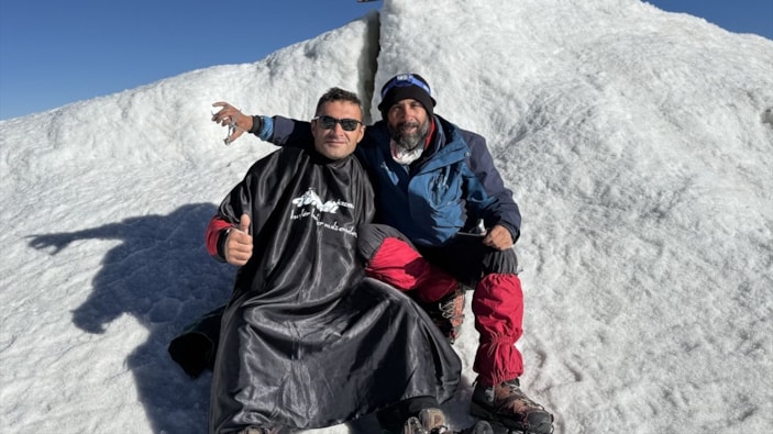 Iğdırlı berber ve dağcı Murat Akay, kendisiyle Ağrı Dağı'nın zirvesinde tırmanan müşterisini, 5 bin 137 metrede tıraş etti.