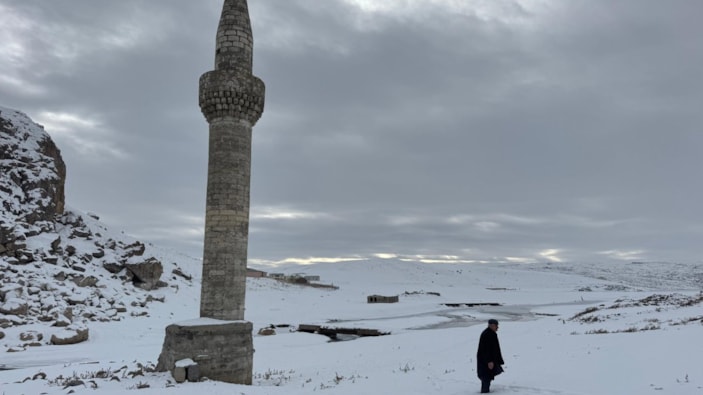 Yıkılmaması ve sunduğu eşsiz manzaranın bozulmaması adına köylülerin etrafını taş duvarlarla ördüğü minarenin kış mevsiminde sunduğu manzara drone ile görüntülendi.
