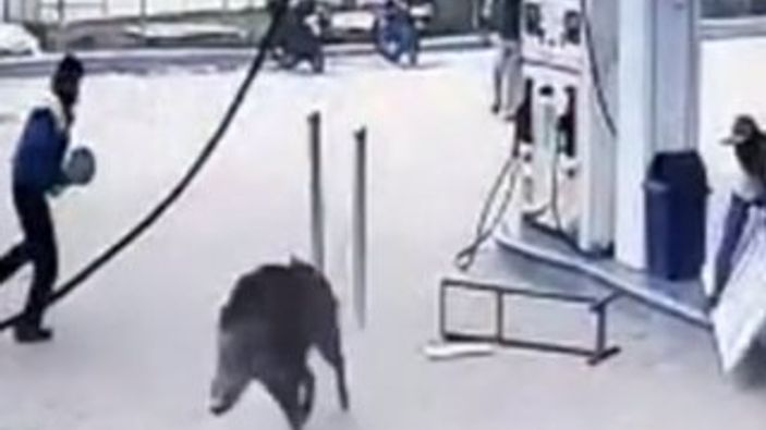 Akaryakıt istasyonuna giren domuz, etrafta koşuşturmaya başlayarak personel ve müşterilere saldırmaya başladı.