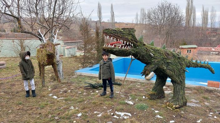 Köyde, zaman zaman arazide gezerken gördüğü kurumuş ağaç ve yosunları toplayan Badem, bu doğal malzemeleri kullanarak evinin bahçesinde dinozor, geyik ve timsah figürleri yaptı.