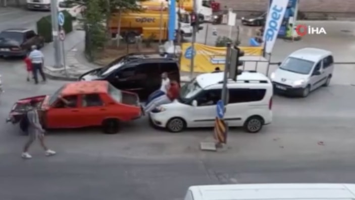 Yardıma gelen şahsın arkadaşları, bozulan aracın arkasına diğer aracı yanaştırdıktan sonra kaputa oturarak itmeye başladı.