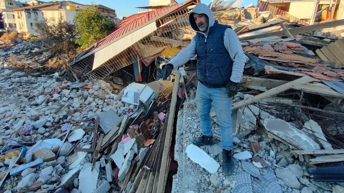 Antakya'da altında işletmesi bulunan tarihi evini ve 27 akrabasını kaybeden İhsan Parıldar, çöken yapıların çatısından ulaştığı evinden eşya kurtarmaya çalıştı.