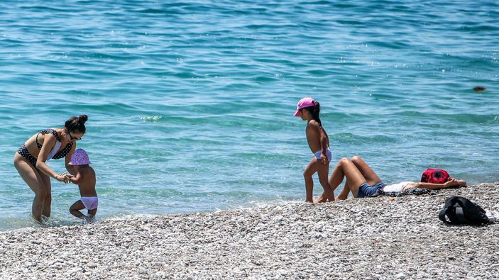 Ramazan Bayramı arifesinde hava sıcaklığı 25 dereceye ulaşınca, kısıtlamadan muaf turistler soluğu Konyaaltı sahilinde aldı. Boş sahile gelen turistlerin bazıları sıcaklığı 20 derece olan denize girdi, bazıları ise kumlara uzanarak güneşlendi.