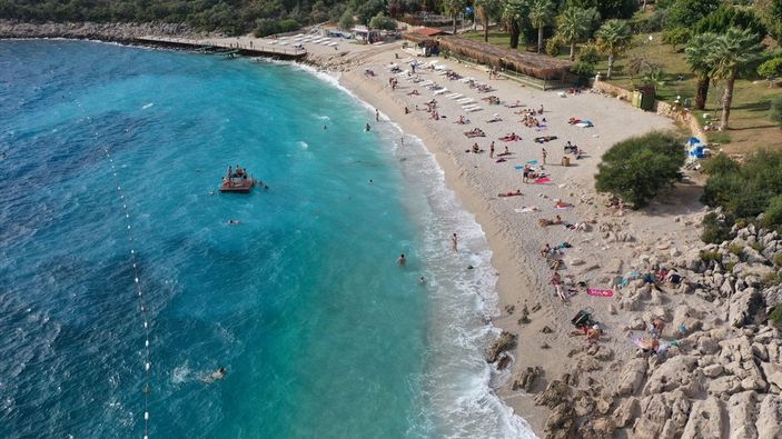 Kaş Sahili'nin plaj kısmında oluşan yoğunluk yaz aylarını aratmazken, turistler bol bol güneşlenip denize girdi.