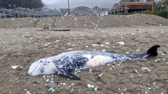Antalya'nın Kemer ilçesinde bulunan bir otele ait sahilde, kıyıya vurmuş ölü yunus bulundu.