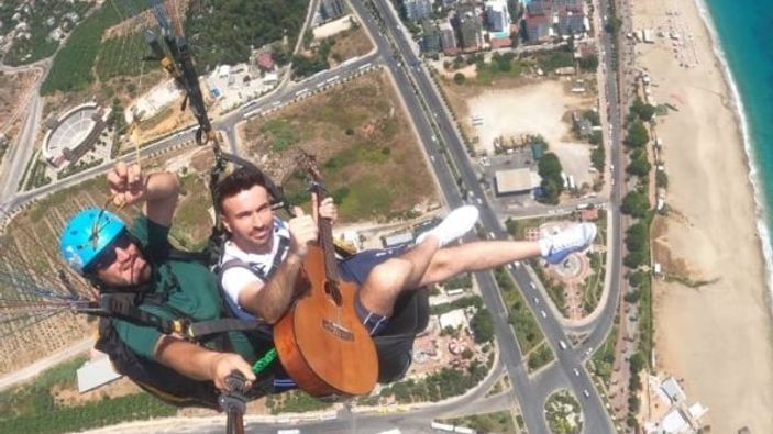 Antalya'da paraşütle uçarken gitar çalıp şarkı söyledi