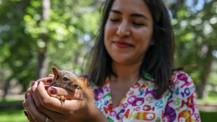 Yavruları parktaki ağaçlardan birinin üzerine koyup, tırmanmalarını izlerken de gözyaşı döken Damla Atay, "Bana geldiklerinde henüz gözleri bile açılmamıştı. Çok küçük oldukları için evime gelip gittiler. Artık fındık, fıstık, ceviz ve tohumlarla beslenebiliyorlar. Hareketliler ve doğada yaşayabilecek durumdalar." diye konuştu.