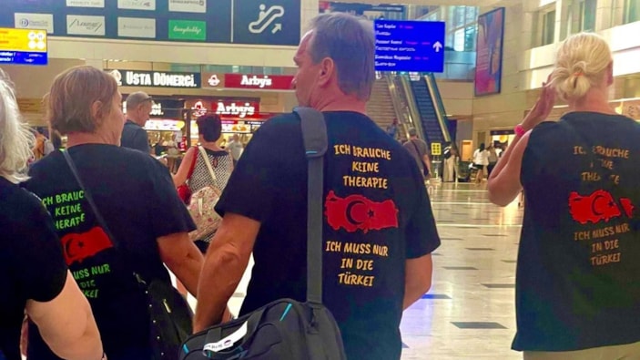 Almanya’dan Antalya’ya gelen turist grubu, üzerinde Türkiye haritası olan ve “Terapiye ihtiyacım yok, Türkiye’ye gideyim yeter” yazılı tişörtlerle geldi.
