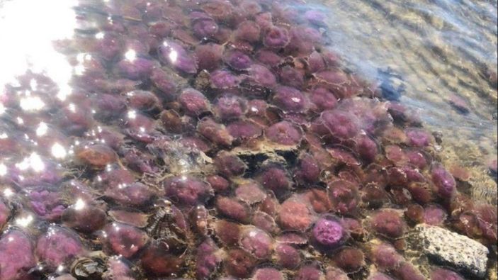 Hatay'ın Arsuz ilçesi Karaağaç sahilinde yürüyüş yapan vatandaşlar, kıyıda çok sayıda mor renkli denizanası gördü.