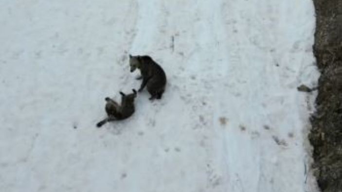 Kaçkar Dağları'ndaki kar yağışıyla eğlenen yavru ayı ve annesinin oyunları drone kamerası ile havadan görüntülendi. O anlar sosyal medyada yoğun ilgi gördü.