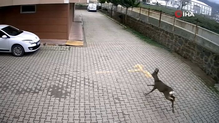 Artvin'de bir sitenin bahçesine giren karacanın sokak köpeklerinden kaçtığı anlar güvenlik kameralarına yansıdı.