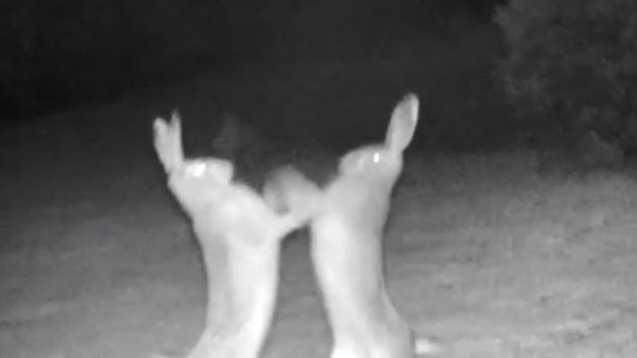 İki yaban tavşanının iki ayak üzerine kalkarak kavga ettiği anlar, fotokapana yansıdı.