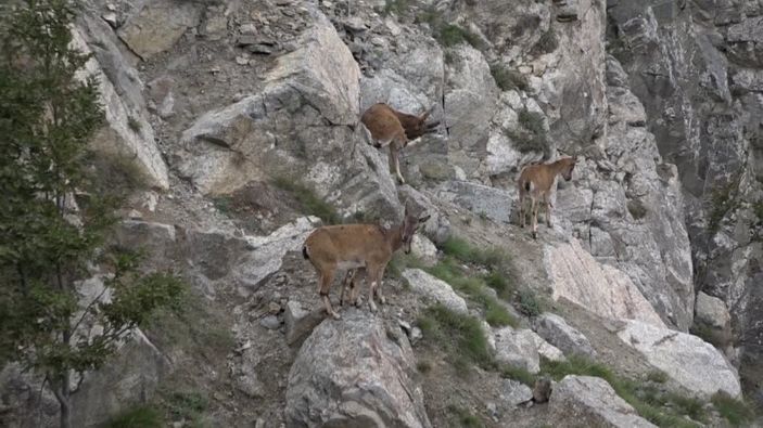 Dik yamaçlarda yiyecek arayışında olan yaban keçileri, kamera ile görüntülendi.