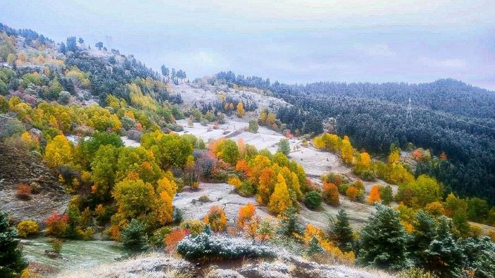 Sakin Şehir unvanlı Şavşat’a yağan kar ise sonbaharın renkleri birleşince ortaya adeta kartpostal görüntüsü çıktı.