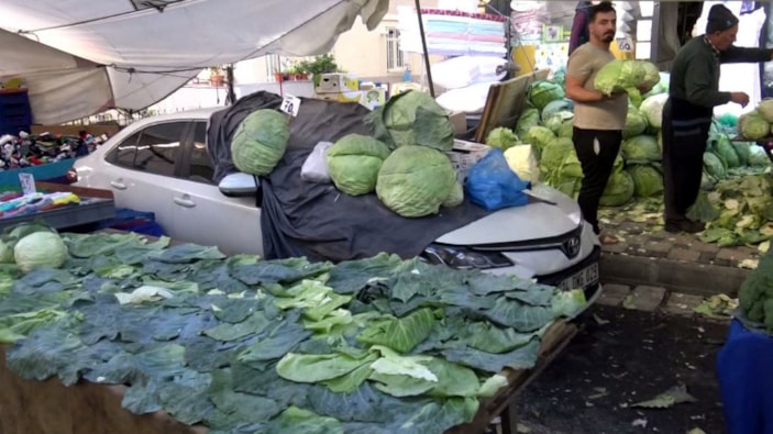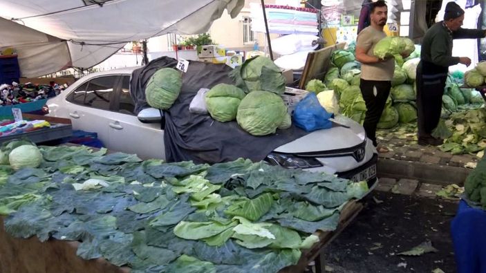 Semt pazarının kurulduğu sokağa park edilen otomobilin sahibine ulaşamayan pazarcı esnafı, bez serdiği otomobili tezgah olarak kullandı. Otomobilin üzerindeki lahanaları gören sürücü ise şaşkınlık yaşadı.