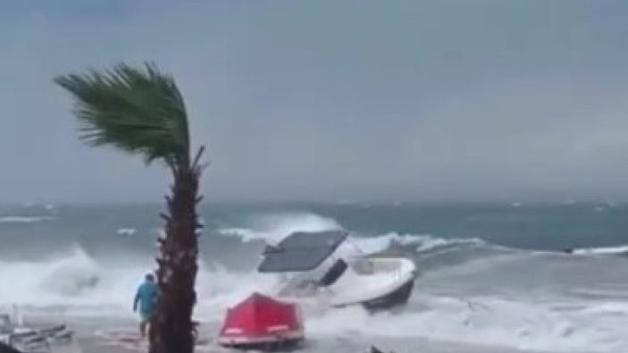 Balıkesir'in Marmara ilçesine bağlı Avşa Adası'nda etkili olan fırtına nedeniyle sahile bağlı tekneler kıyıya çarptı.