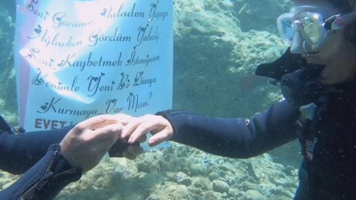“Benimle yeni bir dünya kurmaya var mısın? Evet ise gel sarıl, hayır ise oksijenimi kapat” yazan pankartın önünde genç çift birbirine sarıldı. Onur Bulut tek taş yüzüğü Sevcan Palaza’ya taktı. Daha sonra balıklar ile birlikte evlilik teklifinin hatırası için bol bol fotoğraf ve görüntü çekerek mavi dünyanın güzelliklerini yaşadılar.