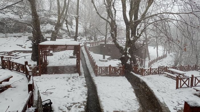 Değirmen, bungalov ev, yürüyüş yolları, asırlık çınar ağaçları ve şelaleleriyle doğaseverlerin uğrak yeri olan alan, beyaz örütsüyle görsel şölen sundu.