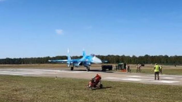 Kalkış için hazırlanan Ukrayna’ya ait bir SU-27 savaş uçağının ortaya çıkardığı hava akımı 2 görevliyi pistin dışına itti. O anlar anbean kameraya yansıdı.