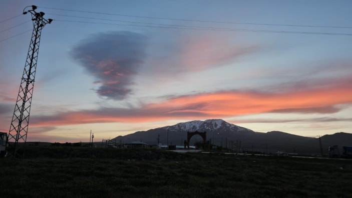 Akşam saatlerinde zirveye doğru yoğunlaşan kızıl bulutlar, dağın karlı zirvesiyle birleşerek adeta kartpostallık görüntüler oluşturdu.