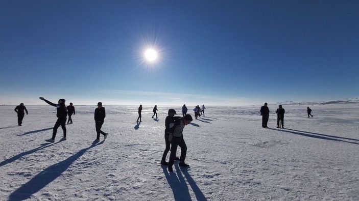 Bağlama çalarak gençleri eğlendiren Ünal Emen ise, “Bizler köylerin gençleri ile birlikte buraya geliyoruz. Her yıl bu dönemde Arin Gölü buz tutuyor. Kalın buz tabakasının üstünde hem futbol oynuyoruz hem de köylülerimizle birlikte halaylar çekerek eğleniyoruz.” dedi.