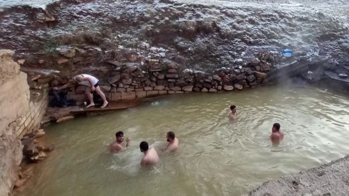 Bitlis’te kış mevsiminde üstü açık kaplıcaya girdiler VİDEO
