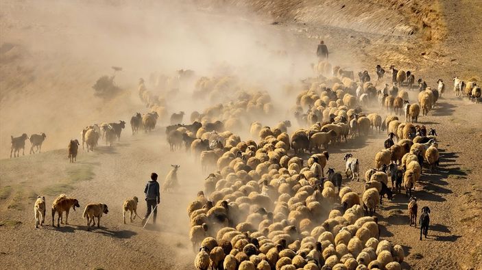 Binlerce koyunun tozlu yolda ilerleyişi, objektiflere kartpostallık görüntüler yansıttı.