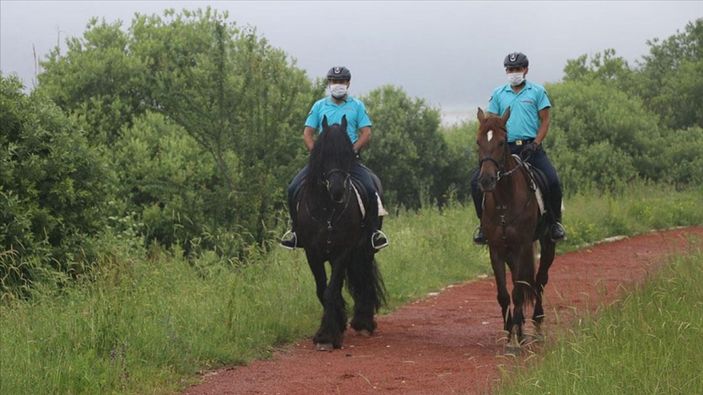 2 atlı tim, tabiat parkında emniyet ve asayiş kontrollerinin yanı sıra yeni tip koronavirüs tedbirleri kapsamında ziyaretçileri, sosyal mesafe ve hijyen konusunda uyarıyor.