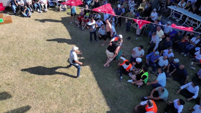 Bu sırada Mustafa Zopalı, kenardaki bir seyircinin ayağından tutarak güreşmeye devam etti.