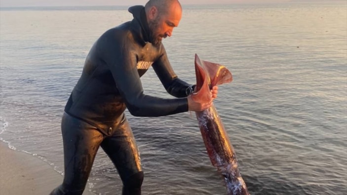 Bu bir rekor! Balıkesir, Ayvalık'ta zıpkınla 1,7 metrelik dev kalamar yakaladı